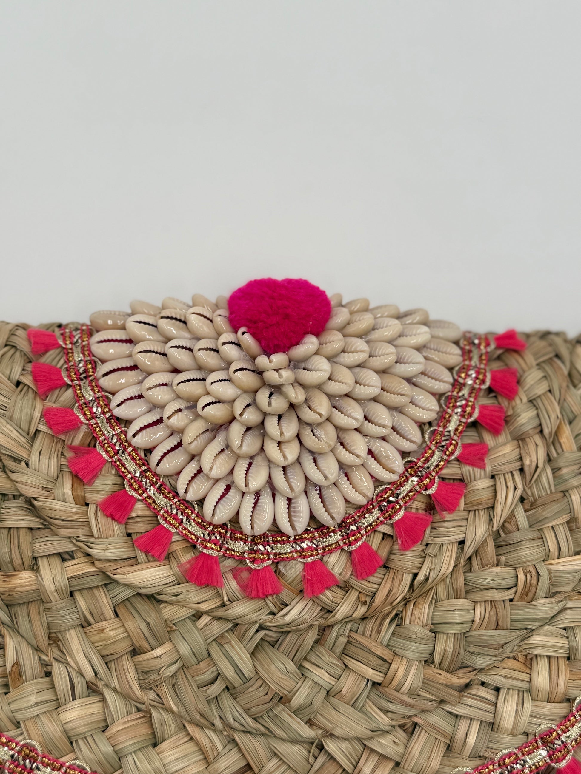 Diese exklusive handgefertigte Clutch ist ein echtes Statement-Piece. Geflochten aus Naturmaterialien, mit kunstvoll eingearbeiteten Muscheln und pinkfarbenen Details, verbindet sie sommerliche Leichtigkeit mit einem Hauch Boho-Glamour.