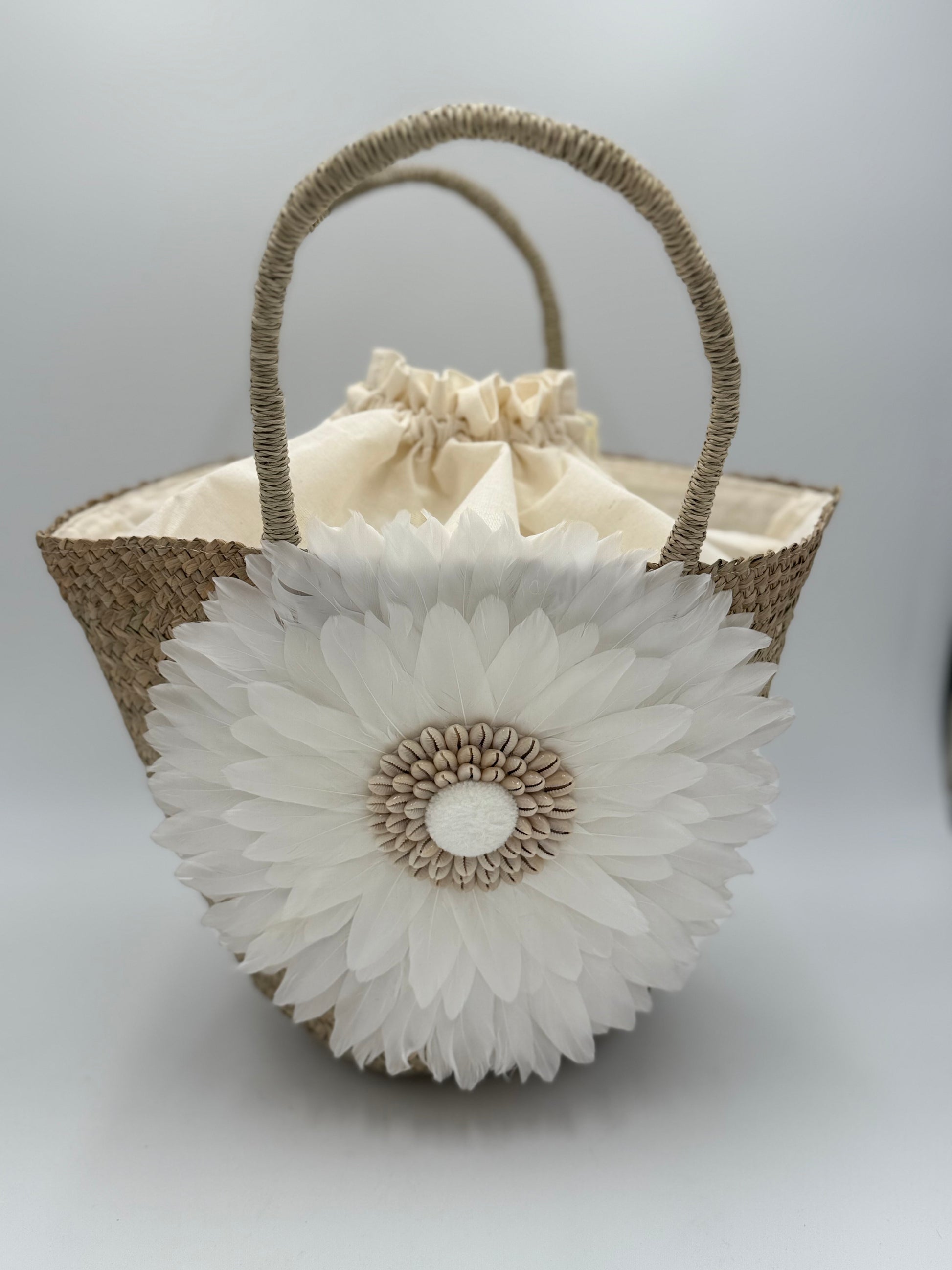 Großes Blütendetail aus Federn und Muscheln, mittig mit Baumwollkern